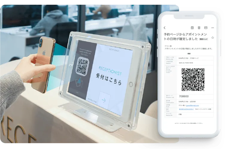 事前に発行したQR受付コードをiPadにかざすと受付完了。お客様が受付で並ぶことなく、ストレスのない受付対応が可能です。