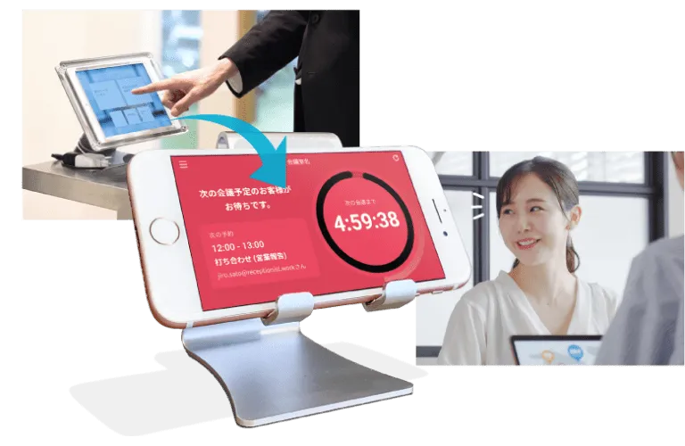 内線電話の取次をゼロにし、社員全員が本来の業務に集中できる環境へ。iPad1台で、来客を担当者のスマホやチャットに直接お知らせ。取次による業務中断をなくし、オフィスワークの生産性を最大化します。